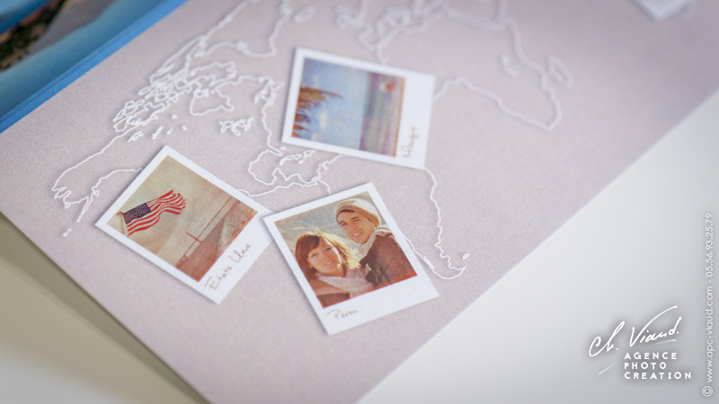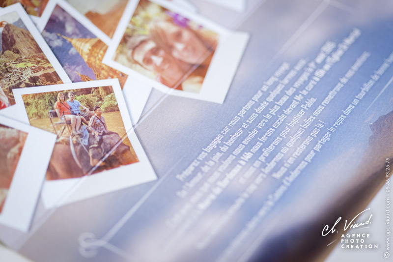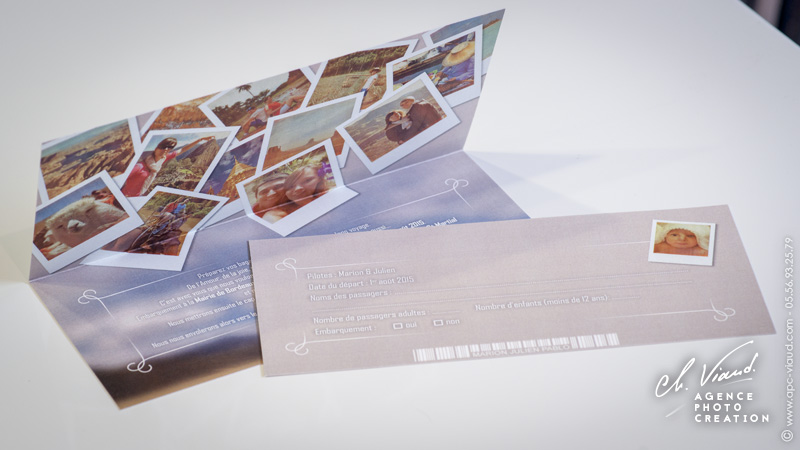 Ce jeune couple nous a fait confiance pour assurer le reportage photo de leur mariage mais aussi pour leur créer un faire-part mariage original, dans leur thème du "voyage" mais surtout qui leur ressemble ! Passionnés de voyage, tout le faire-part tourne autour du travail des photos souvenirs des pays qu'ils ont eu la chance de découvrir que nous avons mis en forme de "photos polaroïd en vrac"... Une mise en page aux couleurs vintage, textes personnalisés, billets d'avion en guise de coupon réponse, faux timbre avec la jolie frimousse de leur petit Pablo, tout a été créé pour leur ressembler et que les invités se sentent plongés dans leur univers...