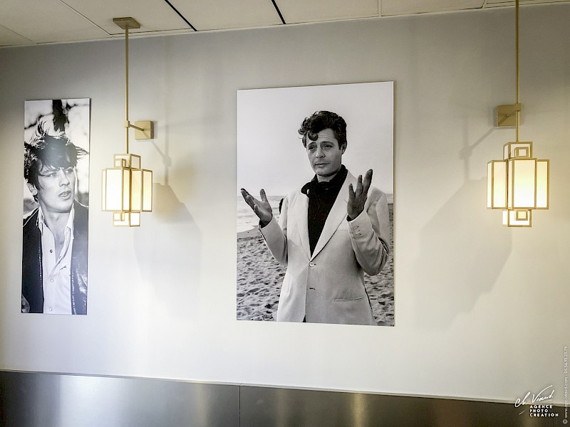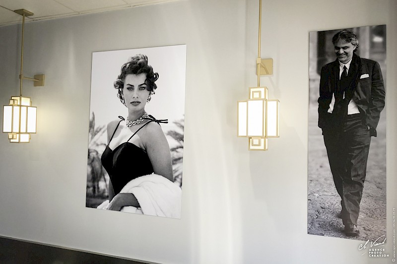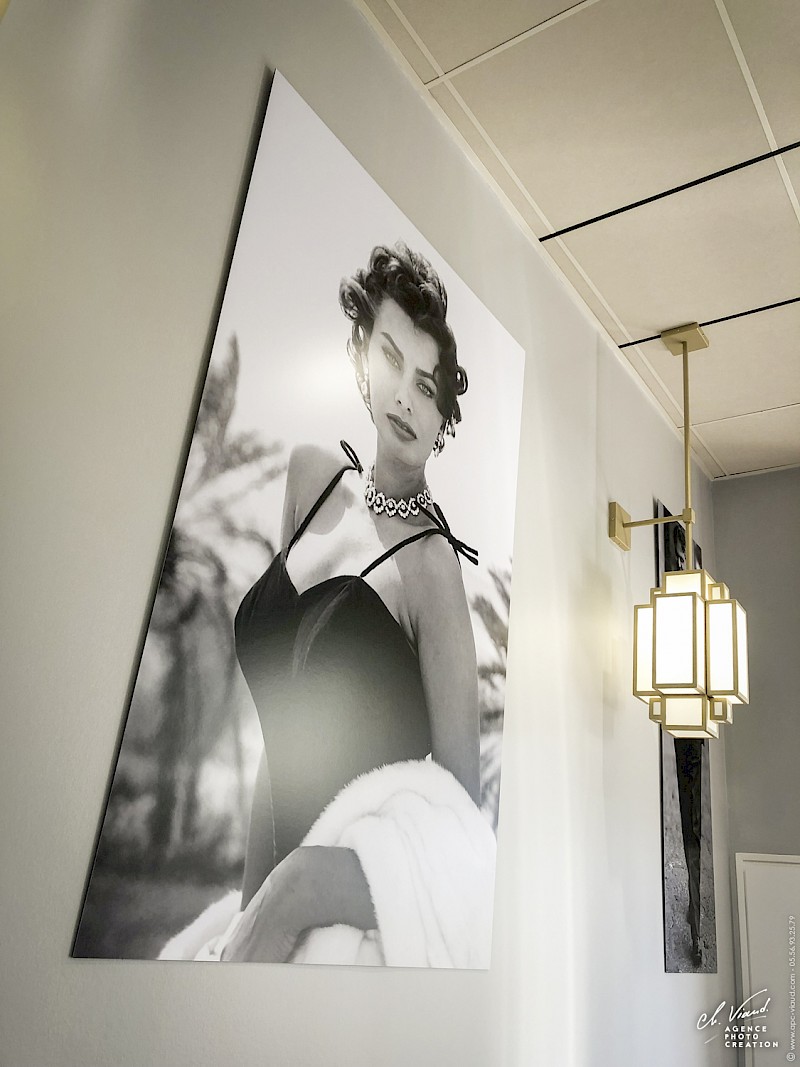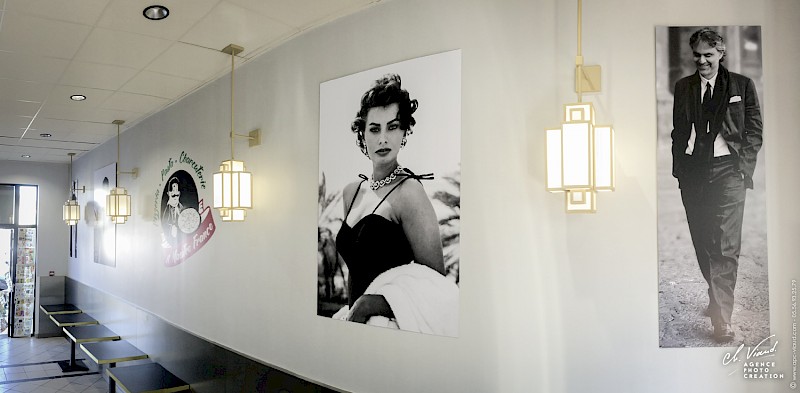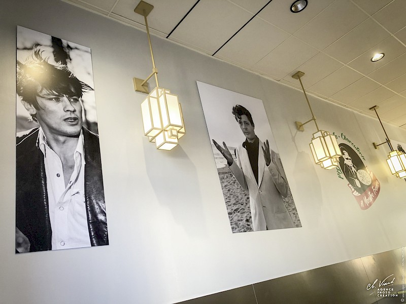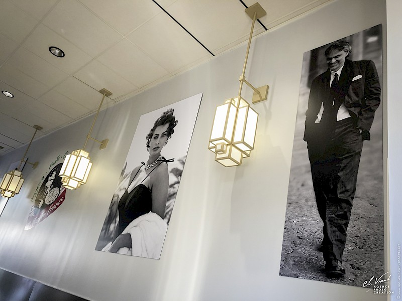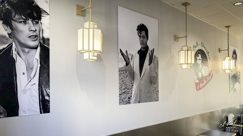 Ici pour ce restaurant Italien, nous avons sélectionné avec eux et ensuite retravaillées des photos de célébrités. Nous avons ensuite proposé des agrandissements sur alu dibond, un medium à la fois fin, élégant, léger et très résistant. Le tirage sur papier photo avant d’être mis sur la plaque d’alu a d’abord été laminé avec un film invisible protecteur afin que dans le restaurant ils soient faciles à nettoyer et ne s’abime pas. A l’aide de mise en situation, nous avons réfléchit aux meilleurs formats et disposition des images.