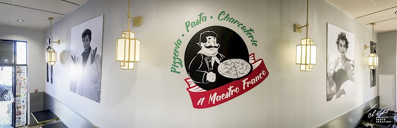 Restait un point essentiel : le logo du restaurant ! L’idée était là, mais elle n’avait pas encore été matérialisée. Nous avons donc dessiné le personnage du pizzaïolo et le lettrage correspondant au nom du restaurant. Pour cette partie centrale de la décoration nous avons conseillé un adhésif polymère à la surface lisse et mat pour que cela s’accorde avec le film de protection des photos qui l’entoure.