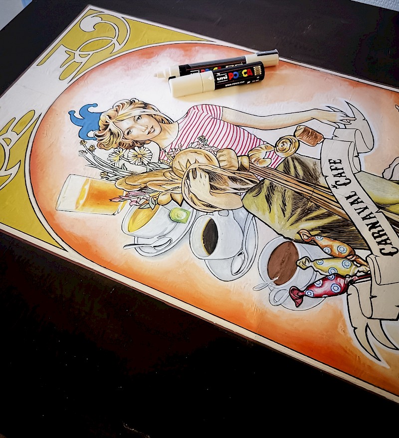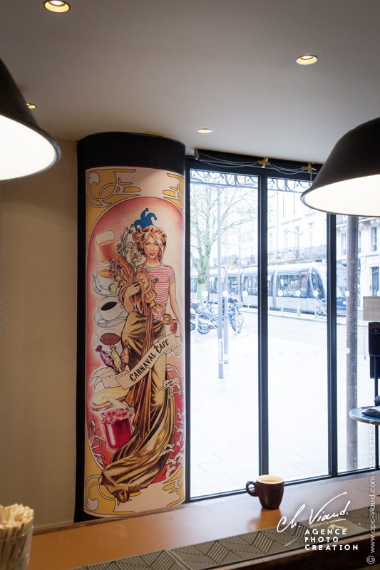 Partir d'une œuvre originale (crée spécialement pour ce bar du centre ville), la reproduire et la retravailler pour ensuite l'agrandir et habiller un grand pilier dans l’espace du Carnaval café à Bordeaux c'est le projet sur lequel nous avons travaillé avec notre artiste local Lordakeem.