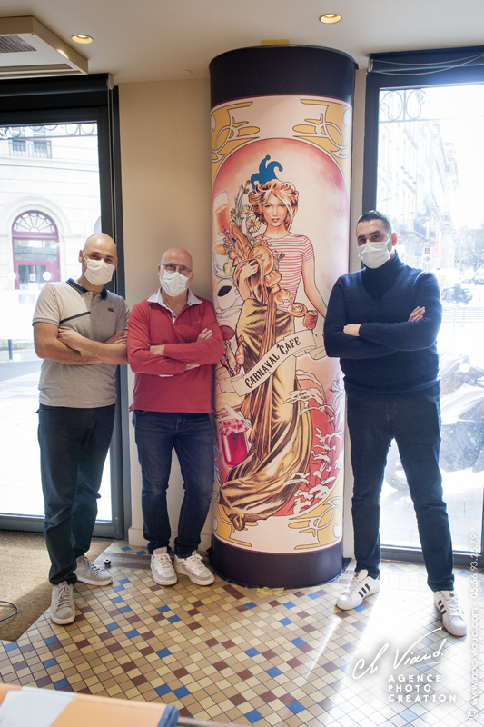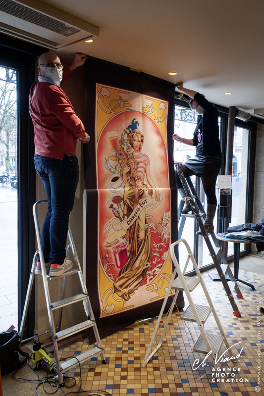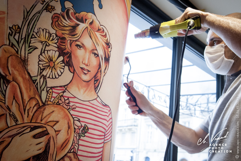 Une fois la mise en situation validée, nous avons pu l’imprimer en taille réelle, avant d’aller l’installer sur place, pour que cet établissement renommé puisse réouvrir avec sa nouvelle décoration déjà prête et mise en place.